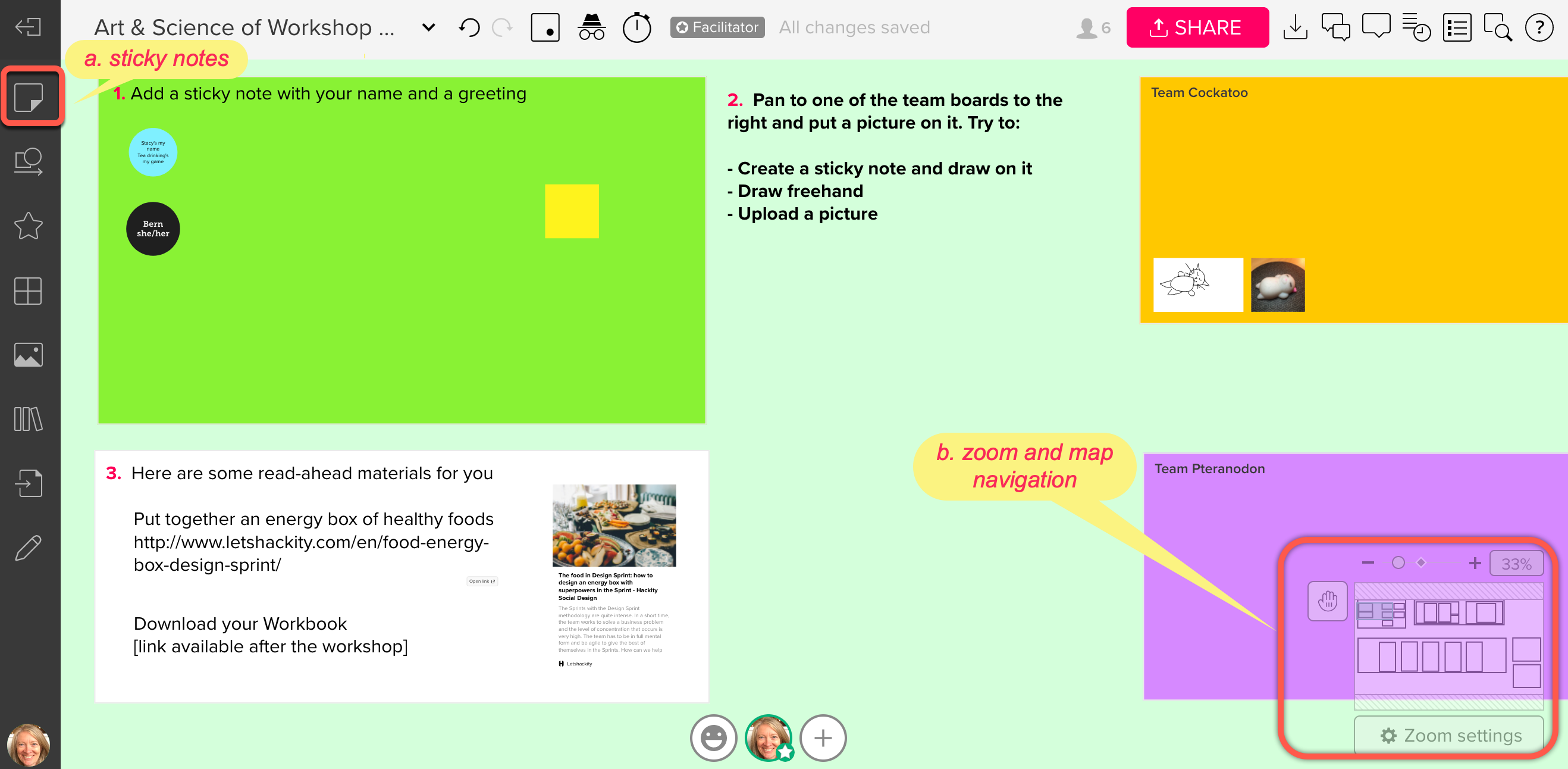 The workshop is itself structured as a template that models and demonstrates workshop design. The presenters will peel back the layers of each component to show how it has been built, how it contributes to workshop goals, and how it can be adapted to different types of meetings and groups. This layering also enables the workshop to offer value to participants at all levels of experience: the foundations and main components of workshop design will be made clear for beginners, and each topic and activity can be engaged at either higher or deeper levels.